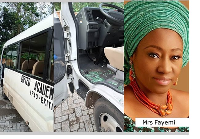 Wife of the Governor of Ekiti State, Mrs. Bisi Fayemi, who was on tour of council areas in the state, escaped being attacked by the protesters as they smashed all the vehicles in her convoy.