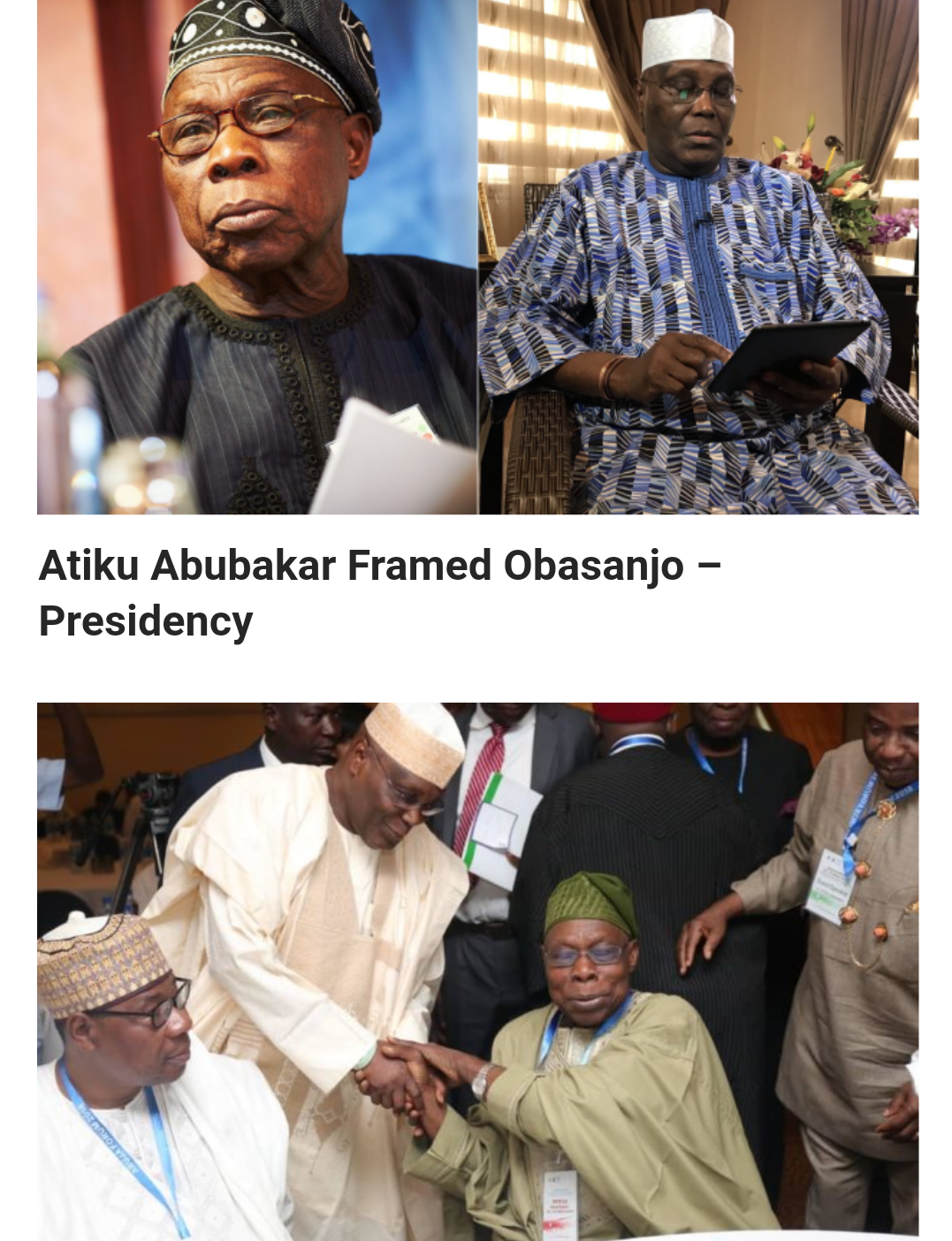 The presidency was reacting to a statement by Atiku claiming that President Muhammadu Buhari’s administration was bent on framing Obasanjo in order to stop him from criticising the present administration.